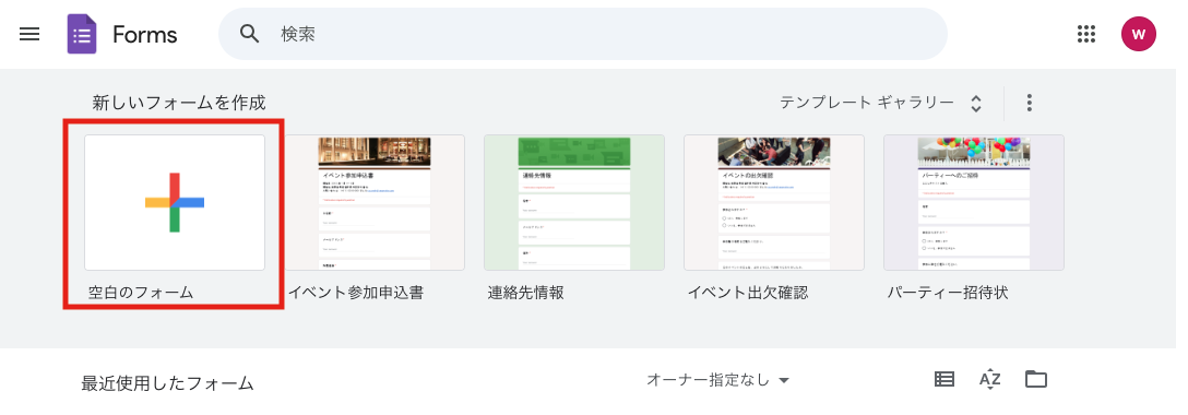 2.空のフォームを作成します。また、テンプレートギャラリーからあらかじめ用意されたテンプレートを選ぶことも可能です。