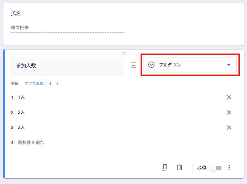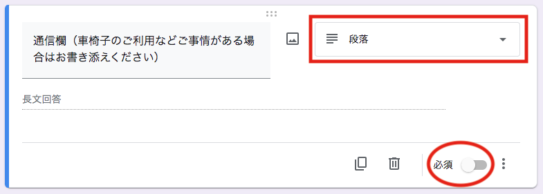 3.必須項目に設定: 質問の右下にある「必須」をオンにすると、その質問が必須項目となり、回答者は空欄のまま送信できなくなります。