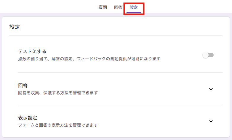 - 画面上部にある「設定」ボタンをクリックすると、回答の収集方法や通知設定などが変更できます。