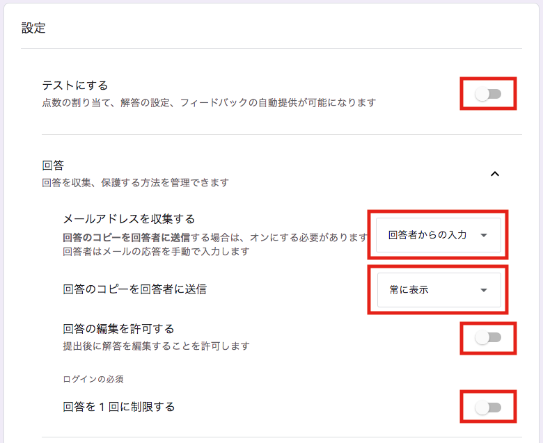 *回答者からの入力、とするのが一般的だと考えます.この項目は特に重要で、googleアカウントを持っていない人からの募集も募りたいケースは注意が必要です.