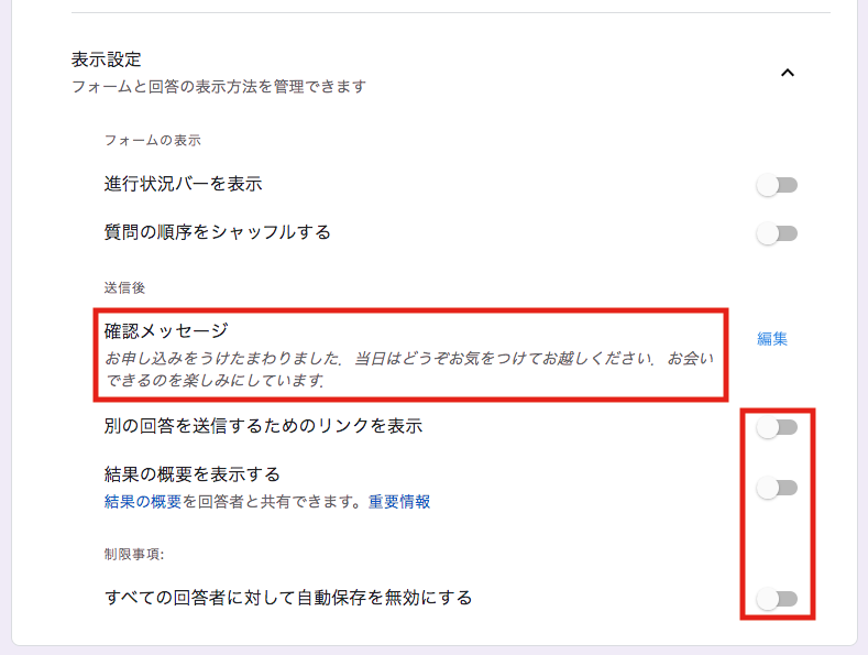 初期設定は「回答を記録しました」です.申し込み後に表示されるメッセージなので、適切なフレーズに編集・保存.