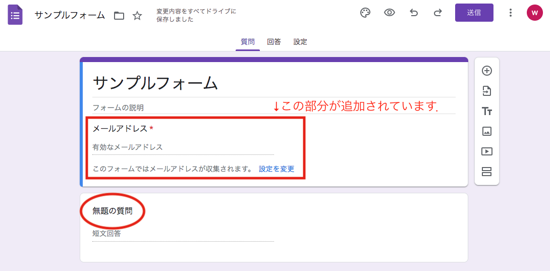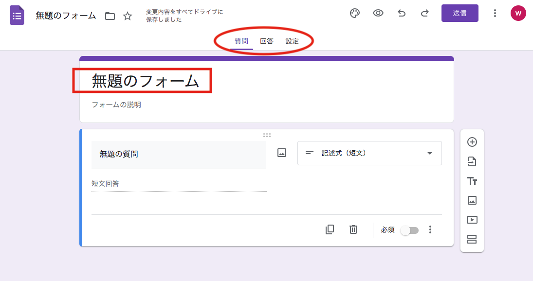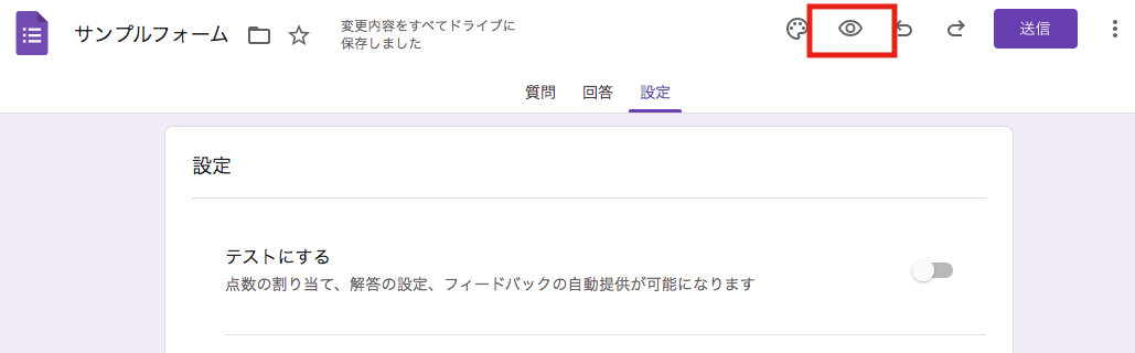 公開するためにクリックするのは、フォームをプレビューした時の、フォーム下方にある「送信」ではないので注意してください.「設定」や「質問」タブを表示している時に右上に表示されている「送信」ボタンです.
