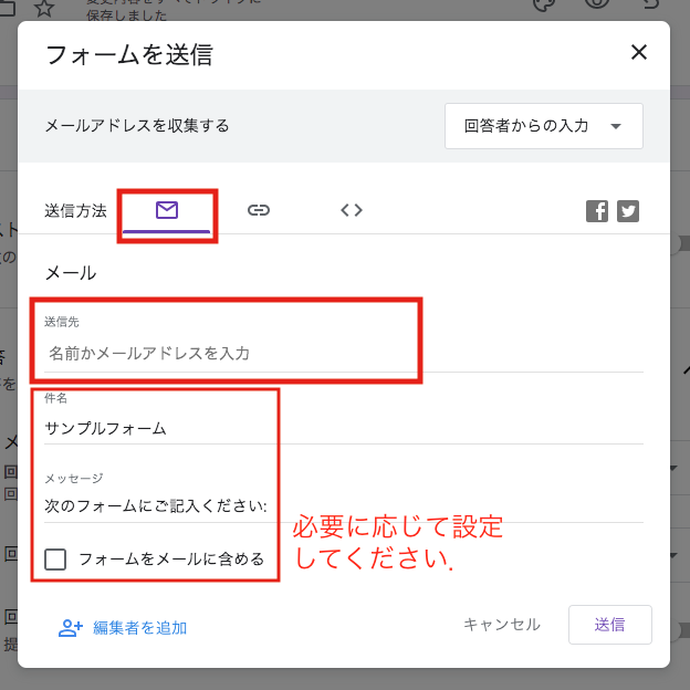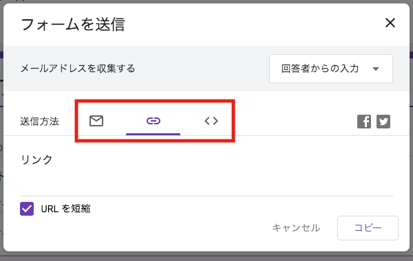 フォームを送るのではなくURLのみ案内してもよいでしょう.メールアイコンの右のクリップを選びます.短縮URLのチェックを入れると短いURLが表示されます.