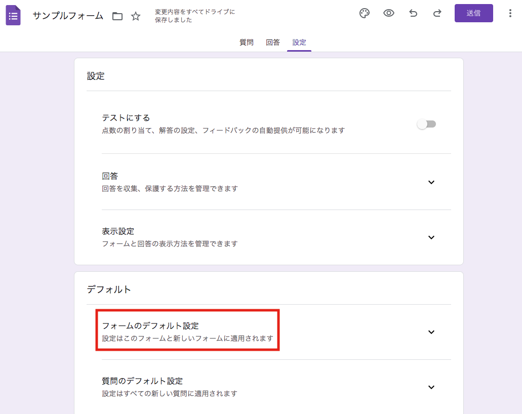 設定画面(3)の下の方にフォームのデフォルト設定があります.それを展開します.