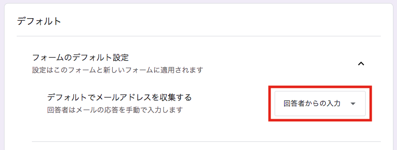 デフォルトでメールアドレスを収集する の項目のオプションを 回答者からの入力 にします(4).