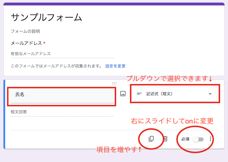 あとは同じ要領で、項目を増やし(紙のアイコン)、増やした項目に対して設定をしていくという流れになります.必須項目の設定に注意してください.