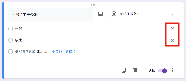 一般/学生の別 は排他的な選択になるので、そういう場合はラジオボタンを選びます.チェックボックスにすると複数選択できてしまうようです.ちなみに、ラジオボタンの選択肢はその行の右のほうにある×印で削除できます.(8)