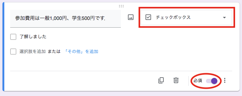 費用の確認はチェックボックスにして、入力必須にしておきます.(9)